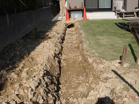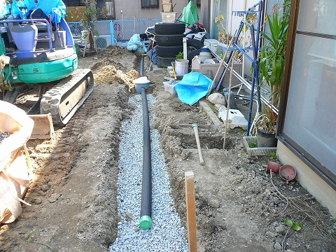 水はけが悪るくお庭に水溜りが出来たり、つねに湿った感じがあるなどの場合、 土の中へ排水管を埋設し、水はけをよくする方法があります。 ※画像をクリックすると拡大されます。